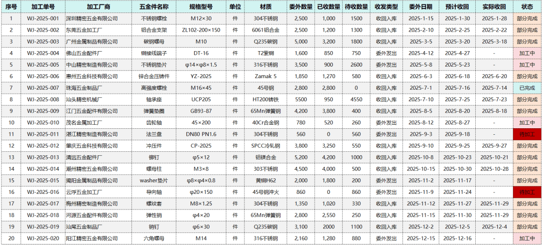 委外加工收发报表,是指企业把部分生产工序、零部件或半成品交给外部加工厂商(也就是我们通常叫的“委外厂商”),专门用来记录“发出去多少物料”和“收回来多少加工品”的报表台账,报表里面会记录发给委外厂商的发料时间、物料名称、规格、数量、对应委外厂商,以及收料时的加工品名称、合格数量、不合格数量、收料日期等。