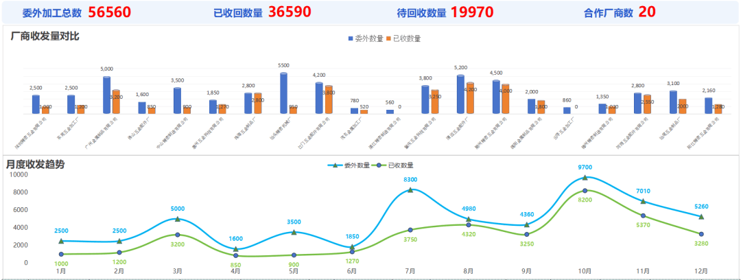 图表展示部分包括了厂商收量对比柱形图和月度收发趋势折线图两个图表,通过图表我们可以一眼清楚哪个厂商收发量的多少,和每月收发趋势。另外在图表上面对委外加工的总数,已收回的数量,待回收数量和委外合作厂商使用公式进行了自动汇总。