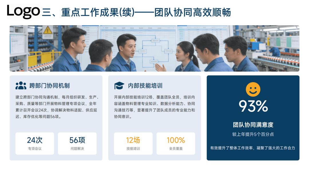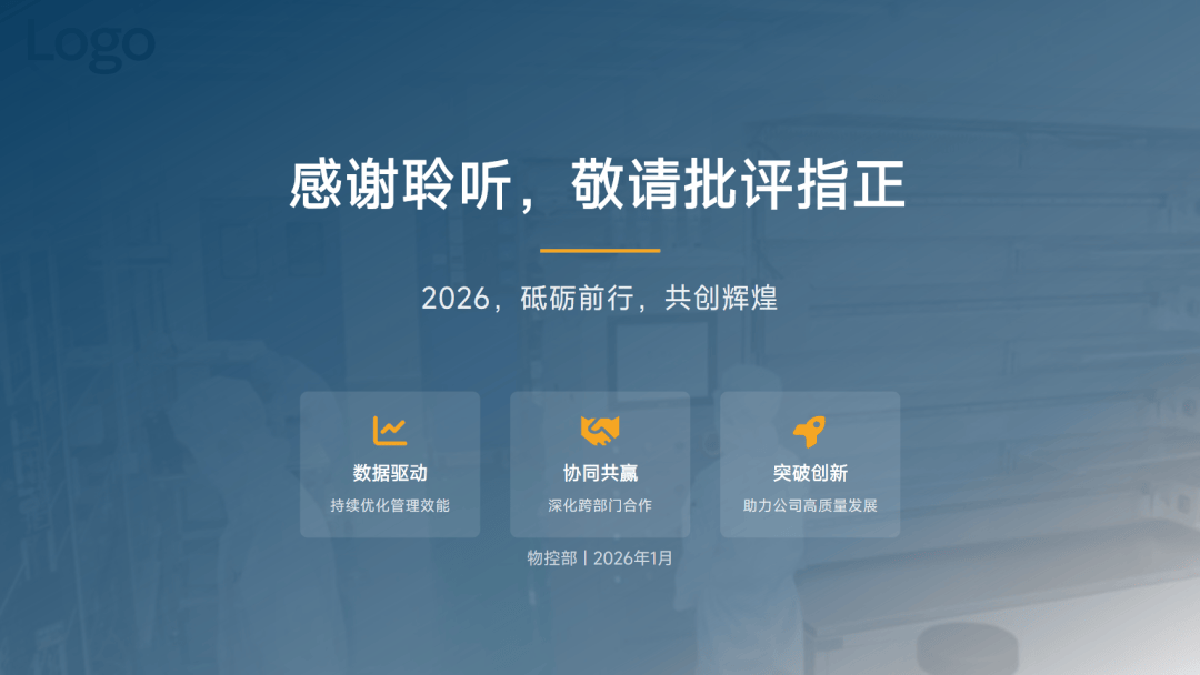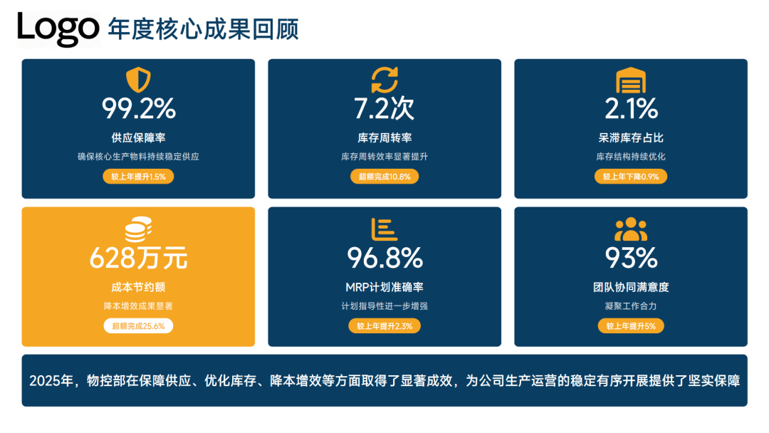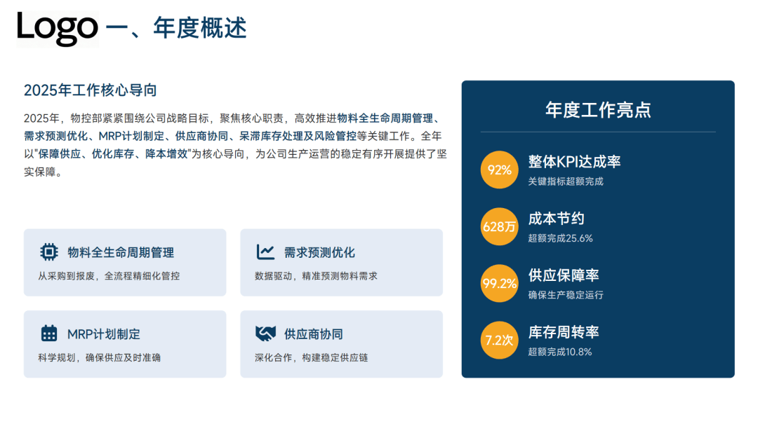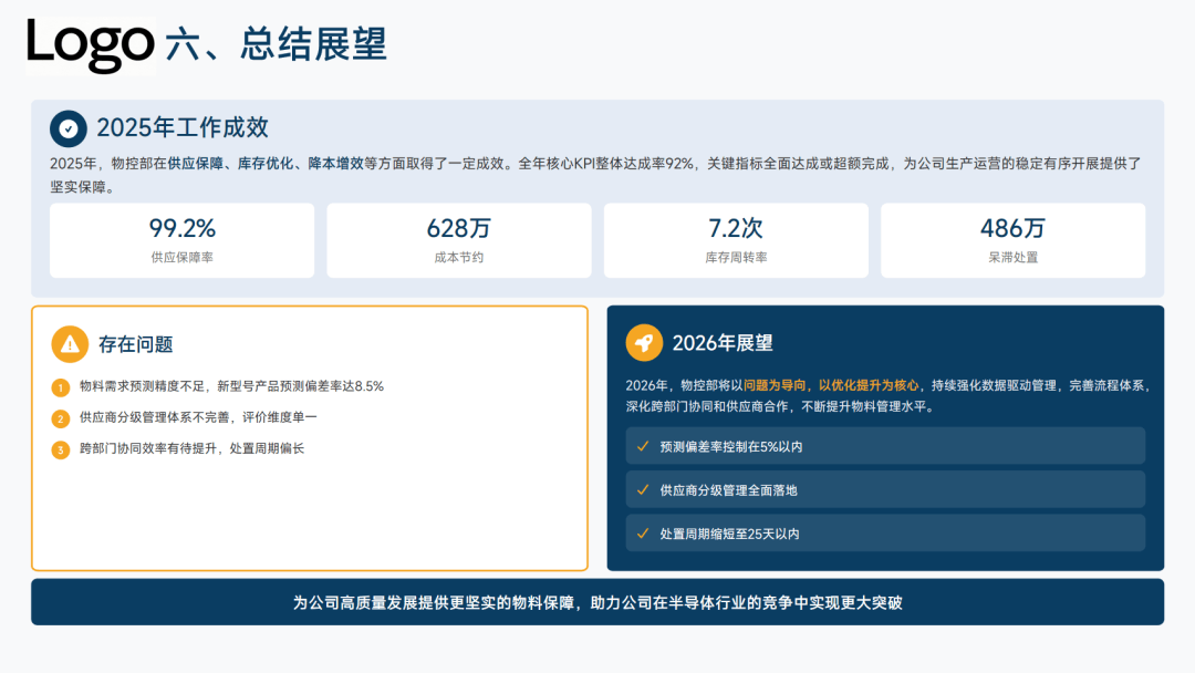 物控员写年终工作总结常遇思路混乱、重点不清晰、数据难梳理等问题!这个物控员年终工作总结ppt模板可直接编辑,包含物料周转率、库存准确率等关键数据的梳理,另外还对问题分析、改进方案、明年工作思路都进行撰写,对物控员快速搭建总结框架、填充优质内容都有帮助。适配全行业物控岗位,新手老手都能用,3小时快速完成规范总结,省时省力省心!