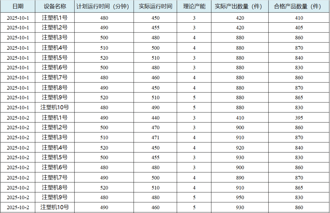 这个工作表主要是录入每台设备的运行时间、产能和合格品等这些数据,根据需要也可以增加计划停机、非计划停机、非合格品、废品等内容。