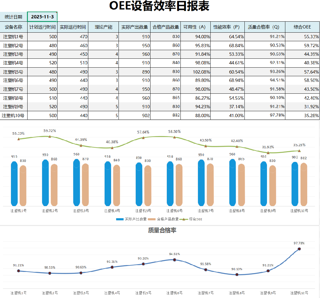 【3合1】OEE设备效率自动统计模板,日报/周报/月报/图表一键生成