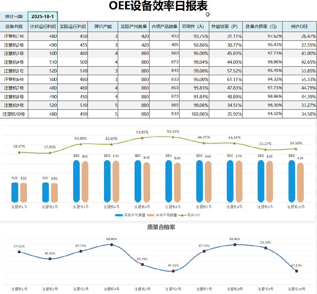 OEE日报是根据在C2单元格输入某一天的日期,就可以自动生成当日的日报表和图表。下面是按照实际产出数量、合格产品数量和综合OEE生成的组合图表;以及质量合格率图表。