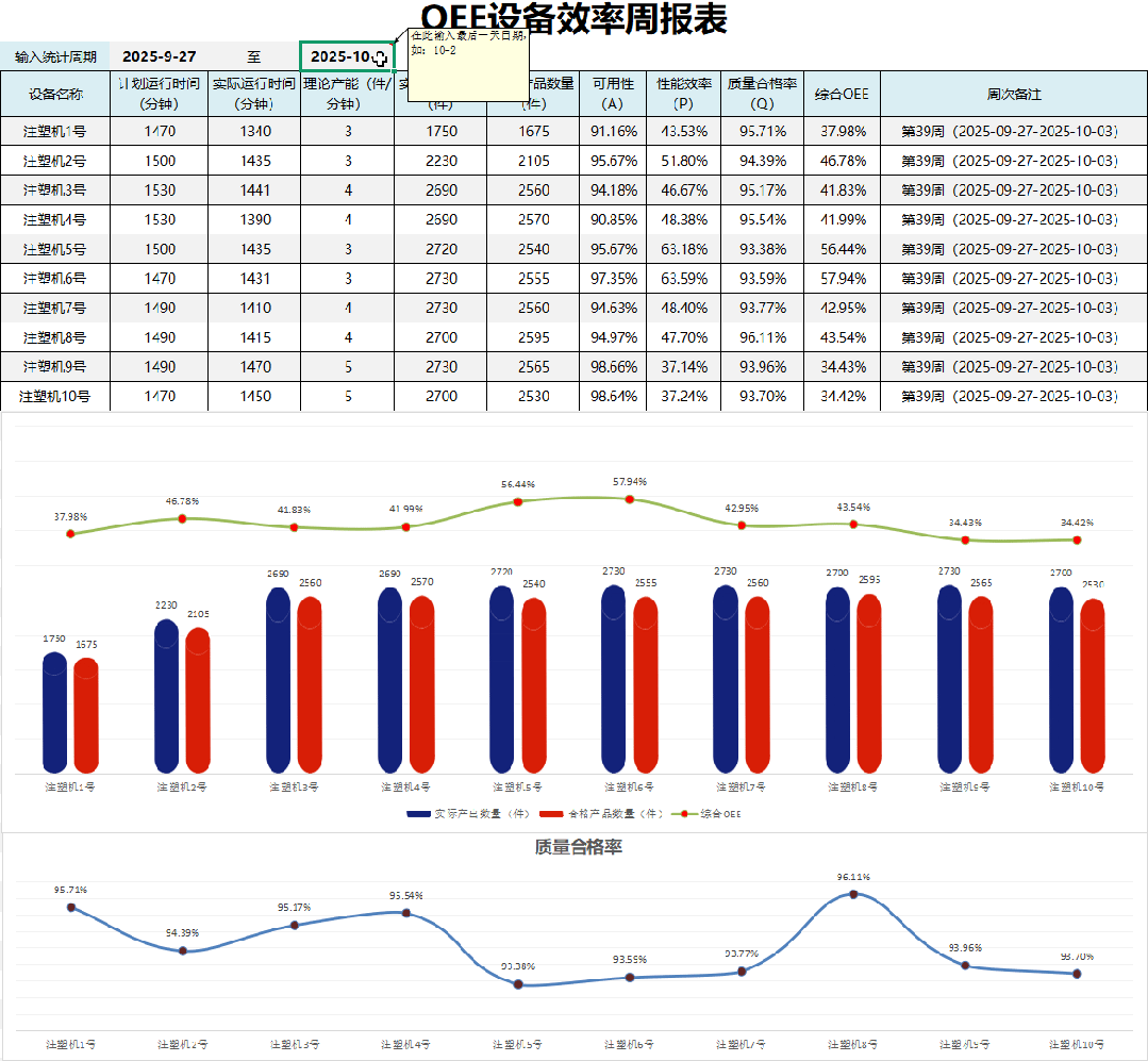 OEE周报是根据C2和E2单元格之间的七天数据量来生成的周报数据,图表也是按照实际产出数量、合格产品数量和综合OEE生成的组合图表;以及质量合格率图表。根据这个周报可以更改成季报、年报表,只需要更改日期公式,改成某个季度或一年的日期期间就行。