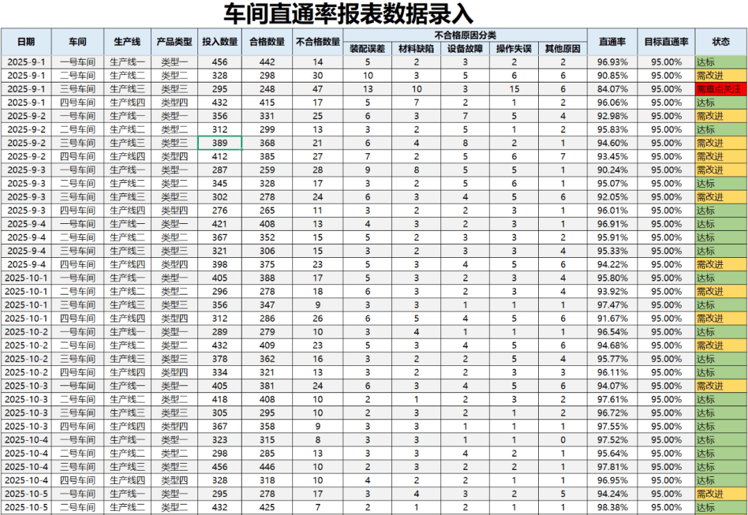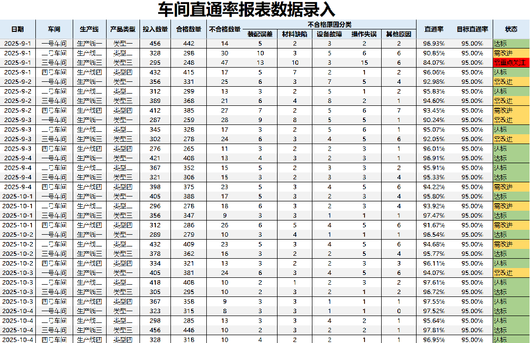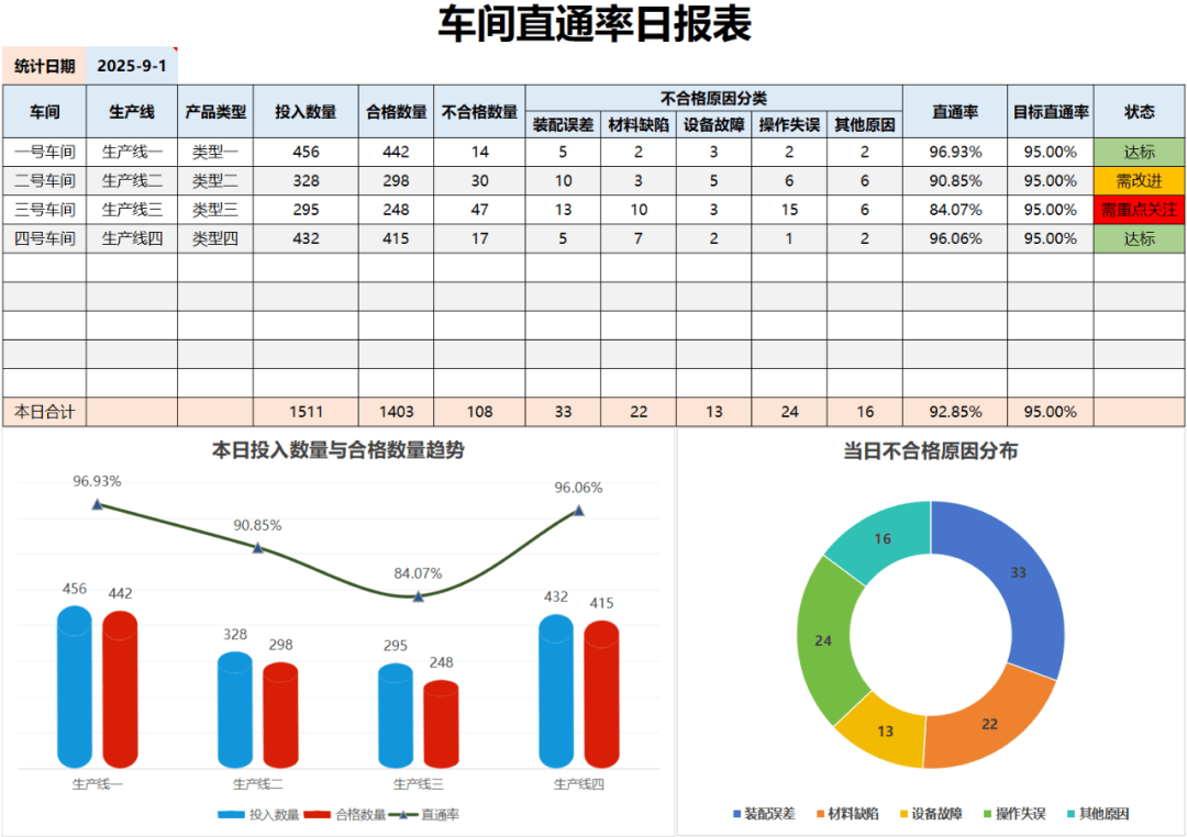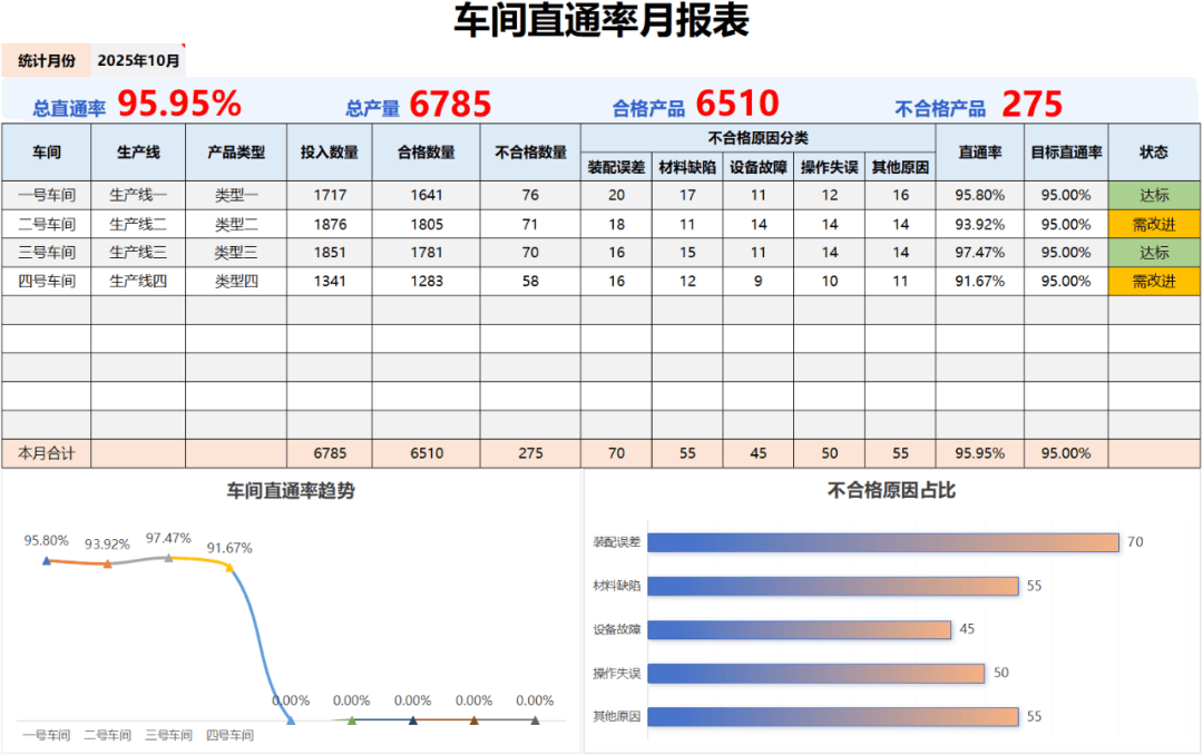 车间直通率统计不用愁!4合1自动报表模板,输入数据直接出图,效率直接拉满!