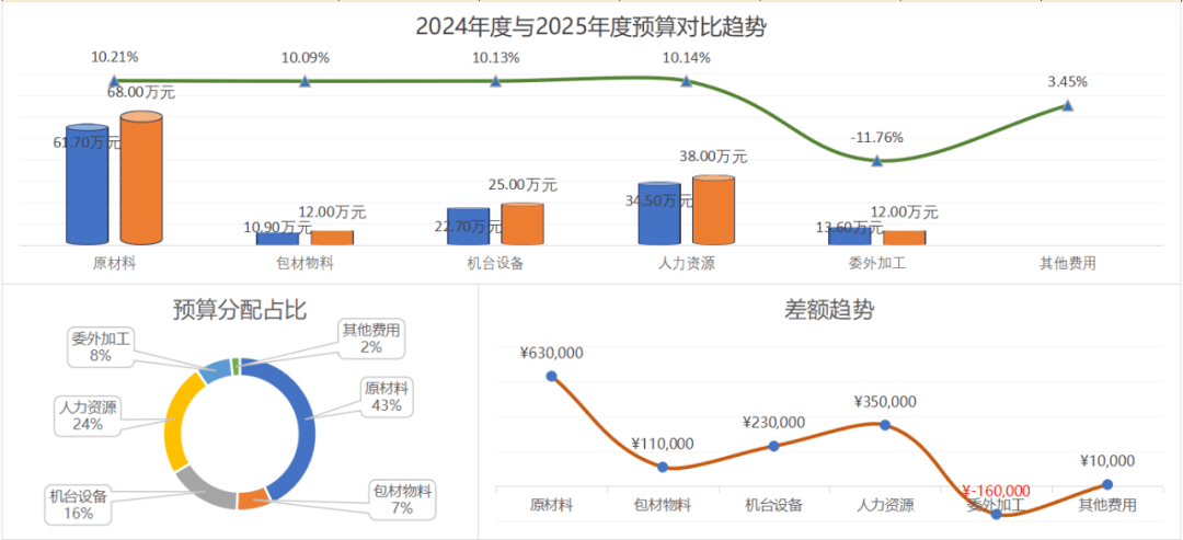 这个部分共三个图表,一个是上年度和本年度预算和同比的柱形图、曲线组合图;一个是各项目类别的预算分配占比圆环图;最后一个是上年度和本年度预算差额曲线趋势图。