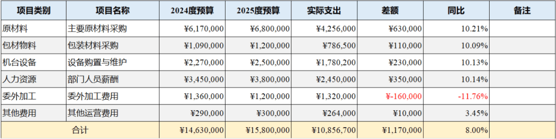 今天跟大家分享一个工作中常用的【PMC年度预算表模板】,这个模板就是生产物料控制部门一年要计划用的钱,比如原材料、机台设备、人力、委外加工及其他费用做好分配,防止乱花,另外就是跟去年做一个对比,超了是超在什么方面,减少是什么原因,让我们把钱管得明明白白。