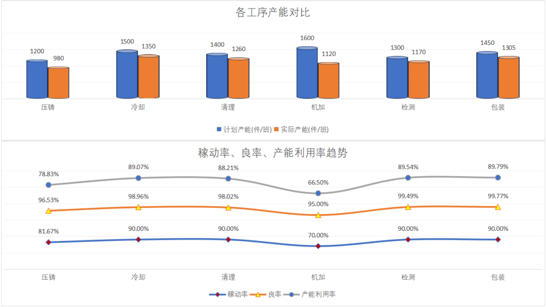 这个部分包括两个图表,一个是各工序的计划产能数和实际产能数的柱形图,一个是稼动率、良率和产能利用率趋势拆线组合图。