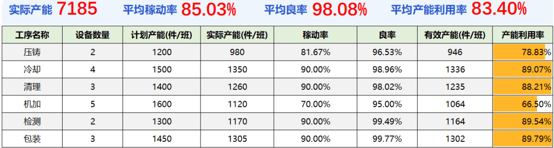 制程产能分析表主要是用来记录生产中各个工序的设备数量、计划产能是多少、实际产能多少、稼动率、良率、产能利用率等核心数据的一种表格工具,通过对数据进行梳理、可视化呈现,找到产能瓶颈在哪里、最终明确改进的方向。