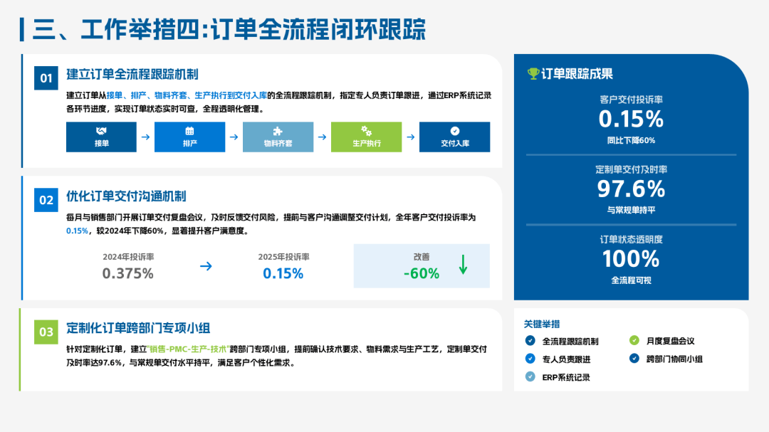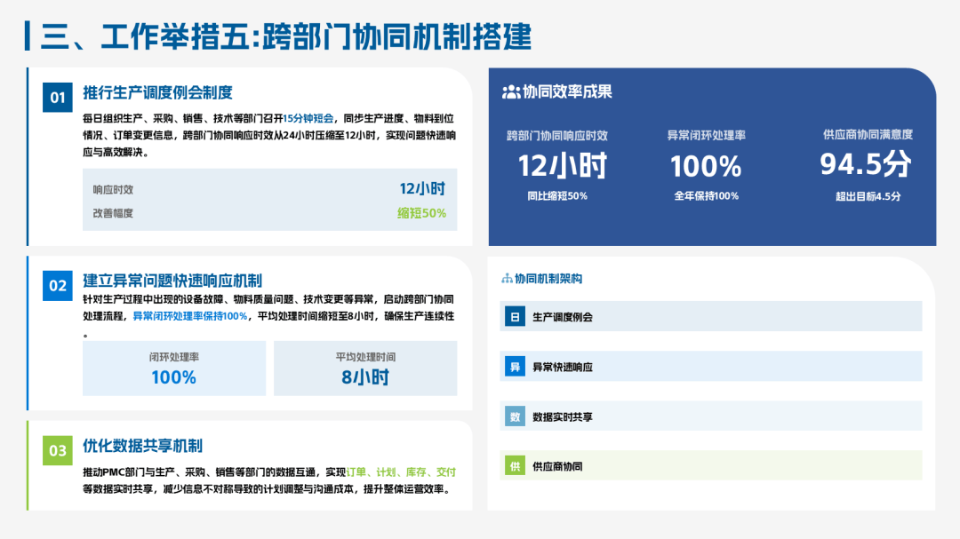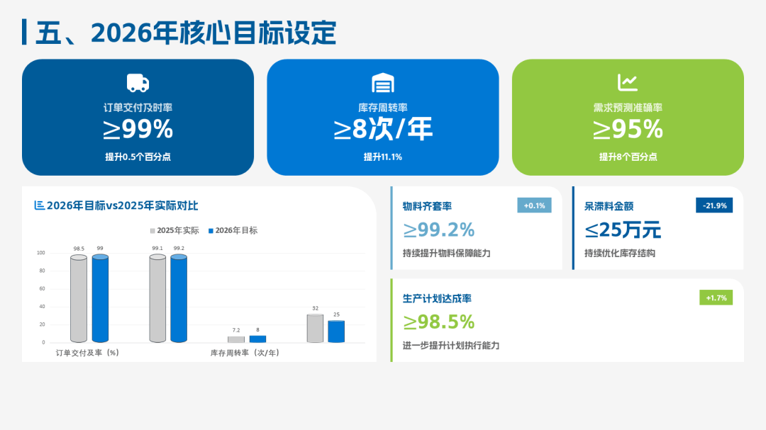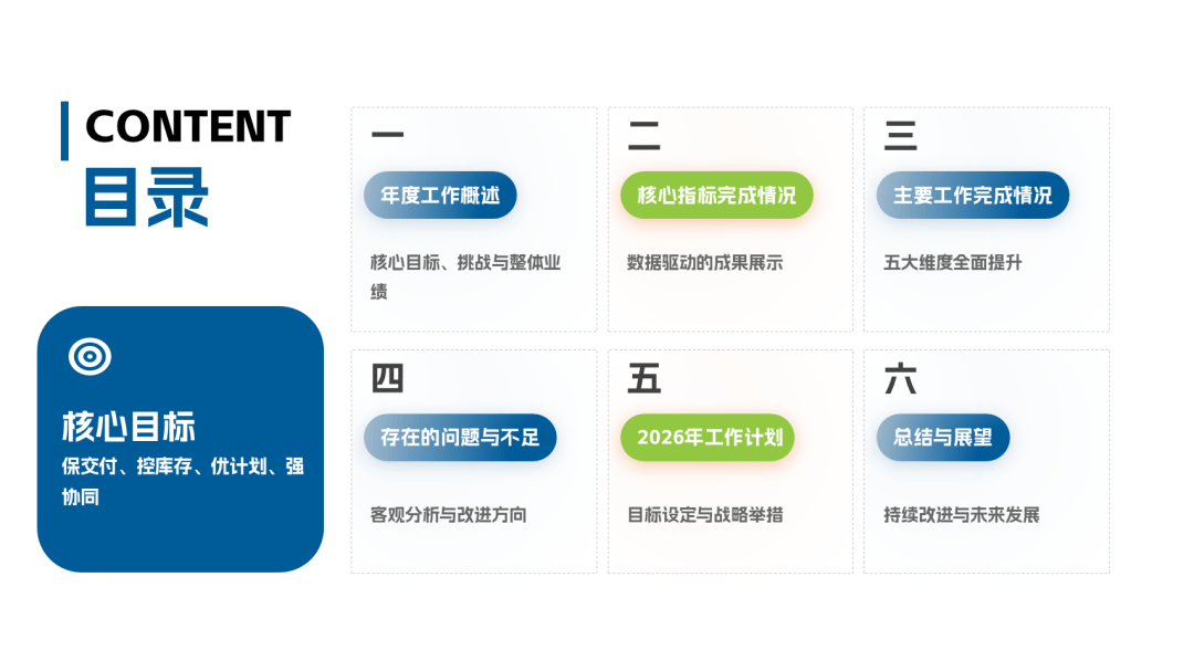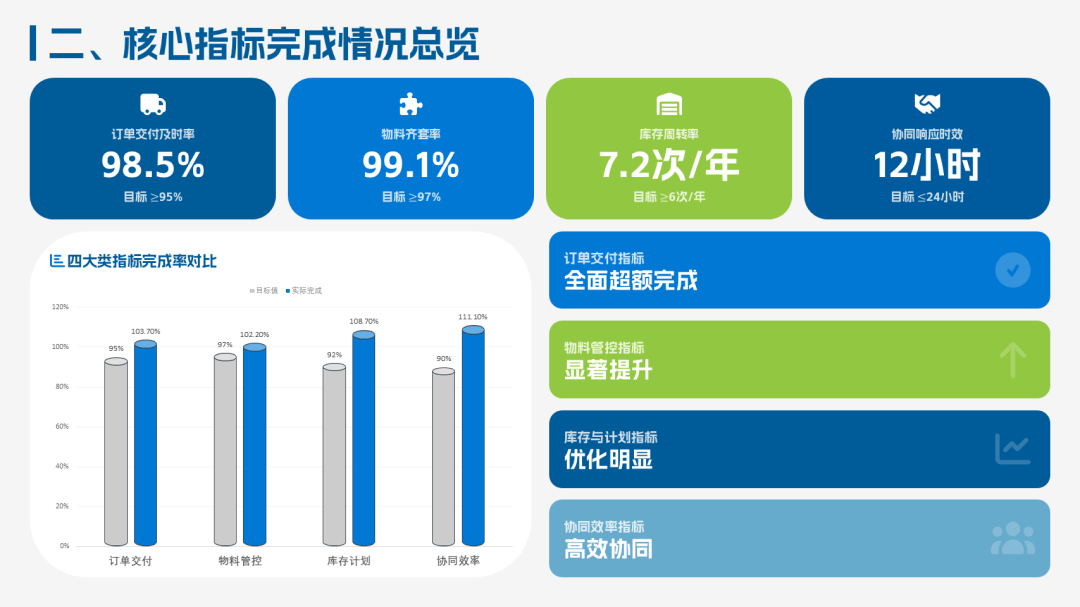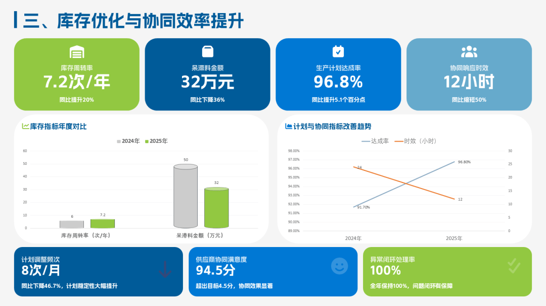 2025PMC经理年终工作总结ppt模板,该总结模板主要聚焦“保交付、控库存、优计划、强协同”的核心目标,复盘了生产计划的精细化、物料管控的精益化、供应链协同的高效化。其中业绩完成情况:订单交付及时率98.5%、库存周转率提升20%、呆滞料下降36%。