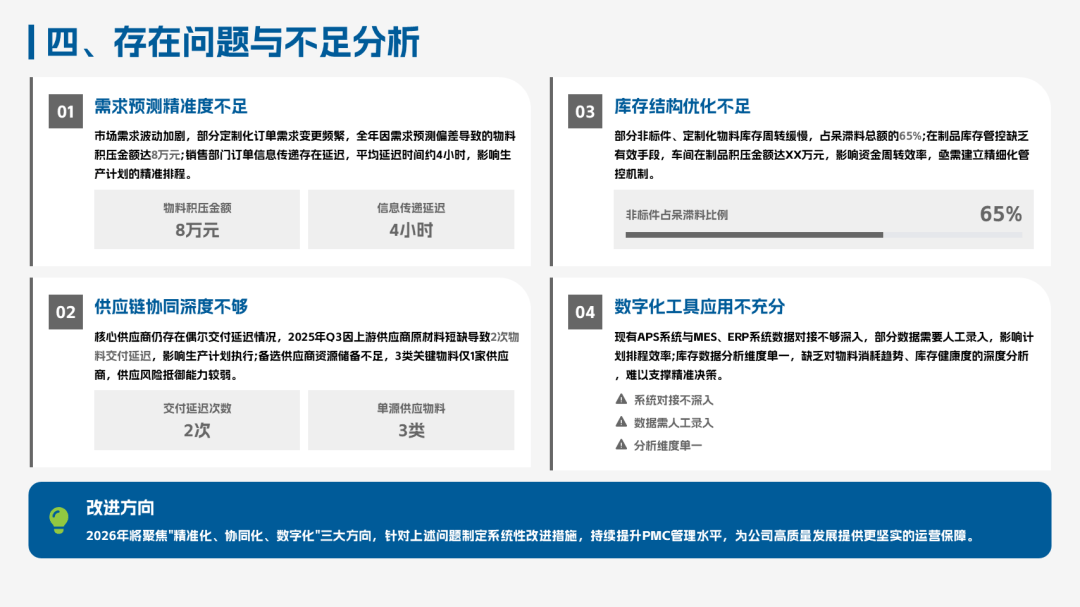 另外还包括核心指标完成数据、现存问题及2026精准化/协同化/数字化规划,是PMC、生产管理岗年终总结参考范本,模板中数据和图表都是可以编辑的,可借鉴使用。