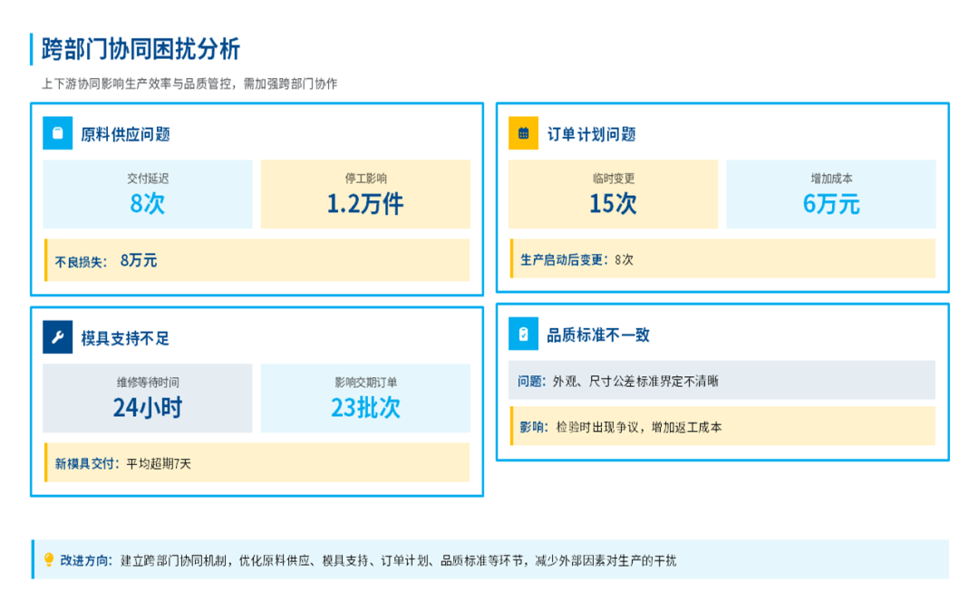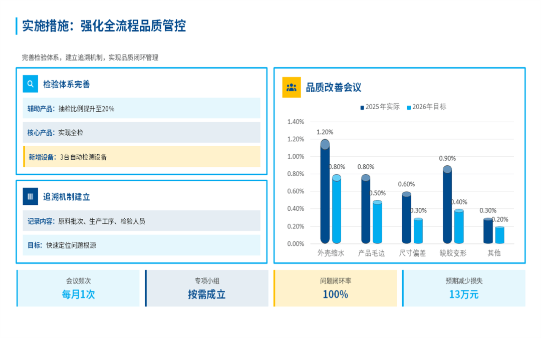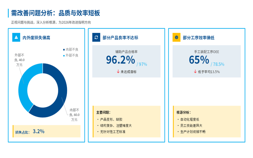 当然,在总结成绩的同时,也不忽视一些问题:比如内外部质量损失还是有点偏高,部分工序的效率瓶颈还没有完全突破,还有一些原材料供应不稳定、模具维修响应慢等难题。