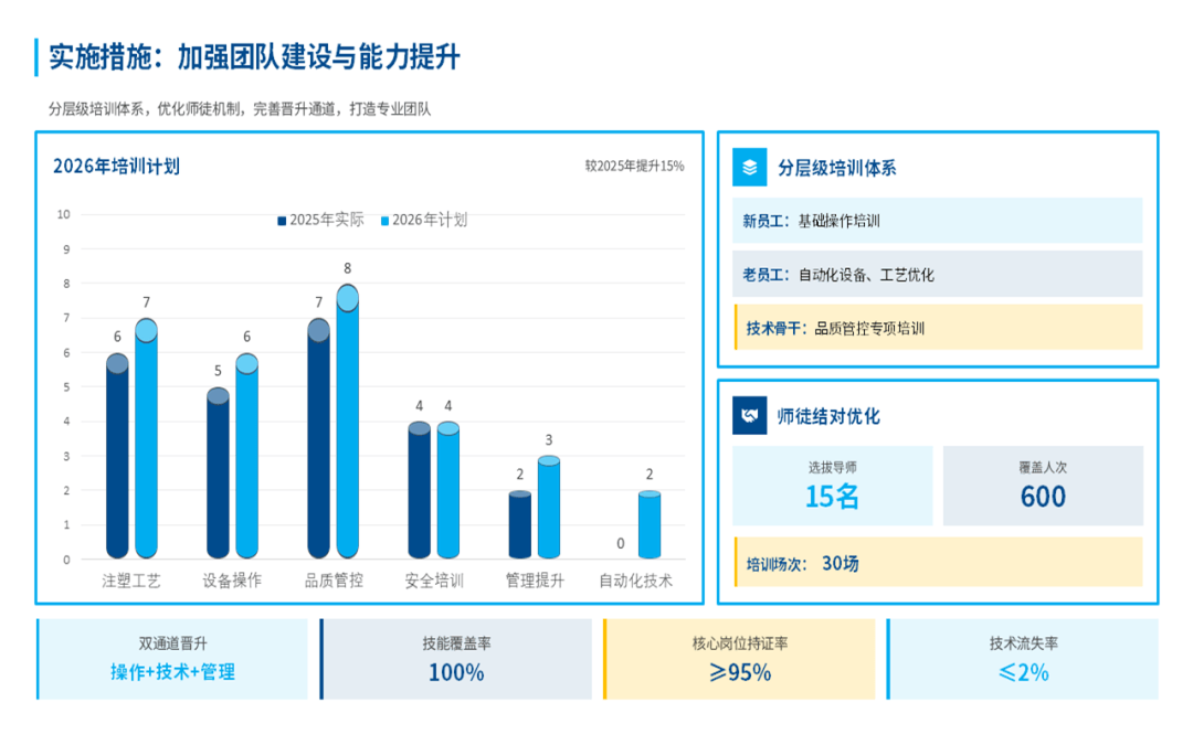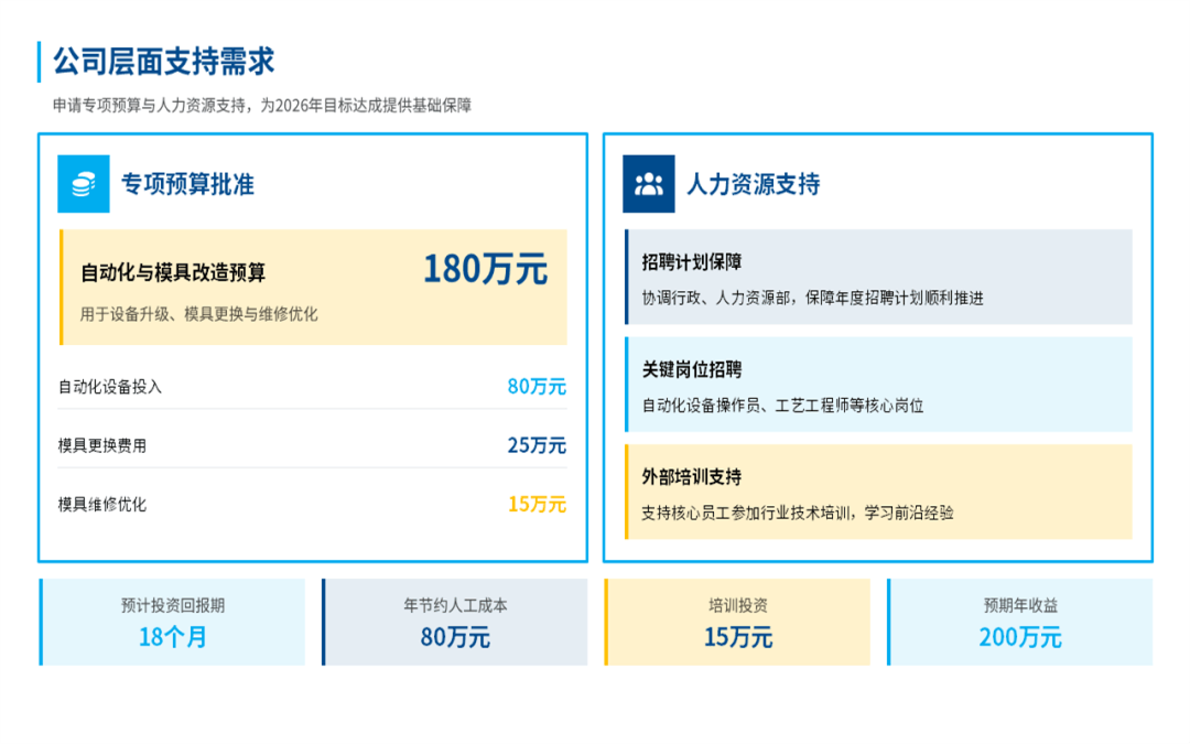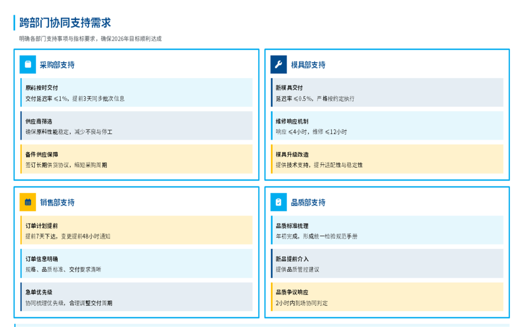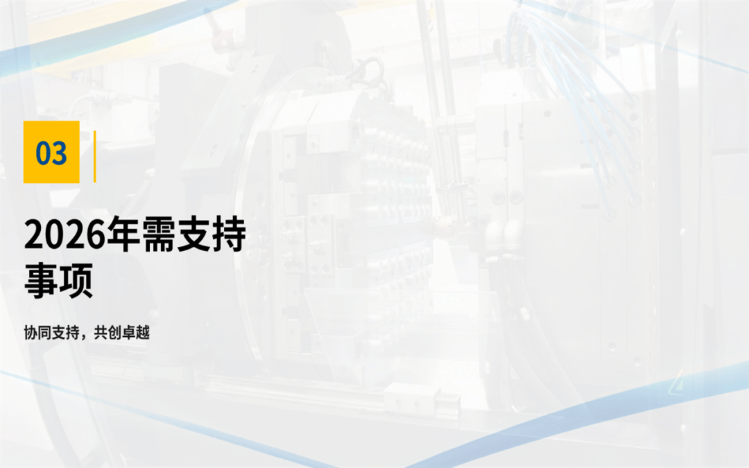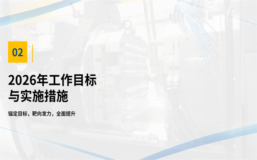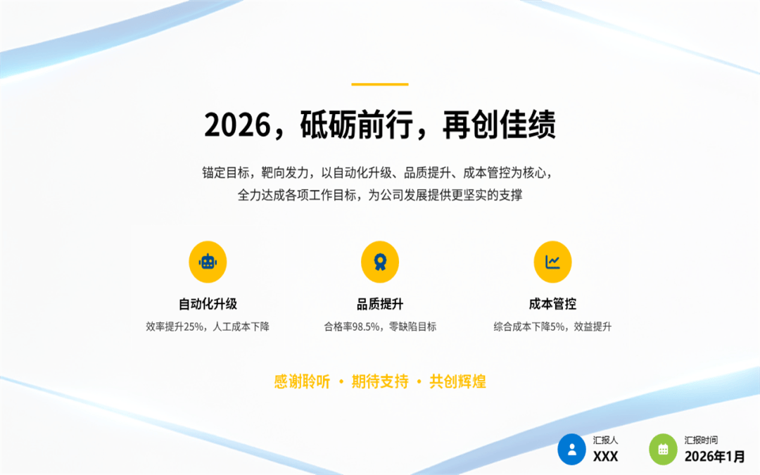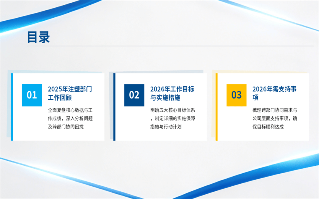 我们看清了问题,也是为了更好地出发,所以呢,在这份注塑部门年终工作总结汇报ppt中的最后部分,对2026年的目标进行了量化,明年我们的工作重心将在深化自动化、抓牢全流程品质、生产管理优化这几个关键环节上。当然,这些还需要兄弟部门的支持和公司领导的协调,我们相信,通过内部持续改善和外部高效协同,注塑部一定能为公司在新一年的高质量发展中,提供更坚实、更可靠的支撑。