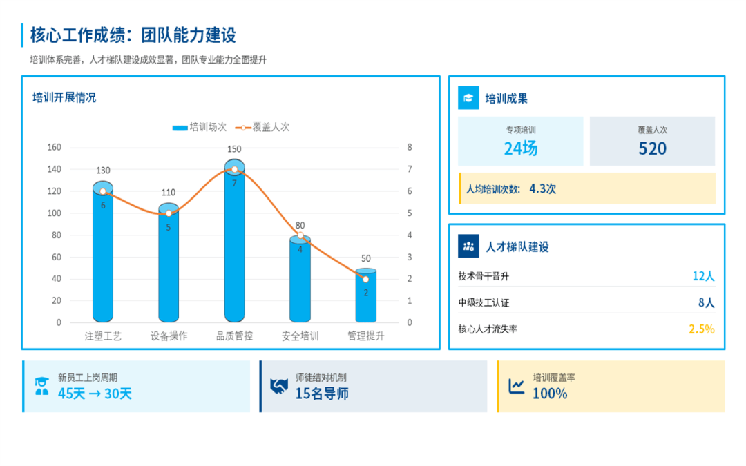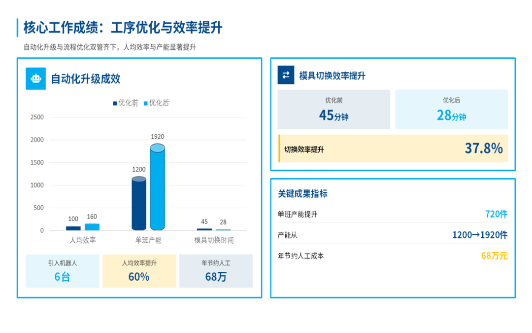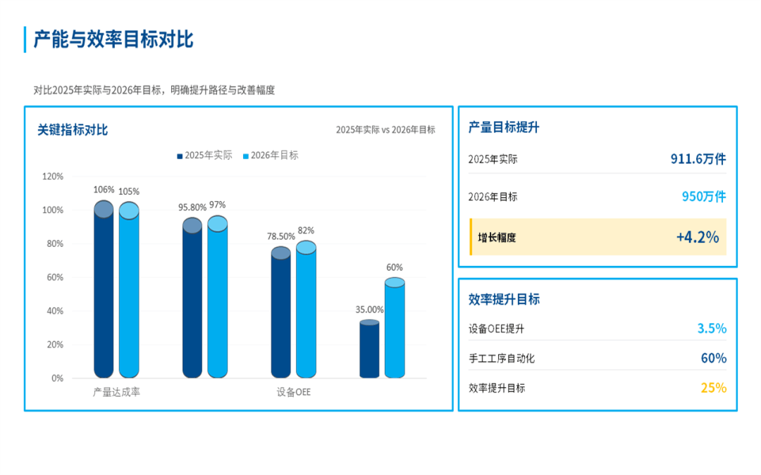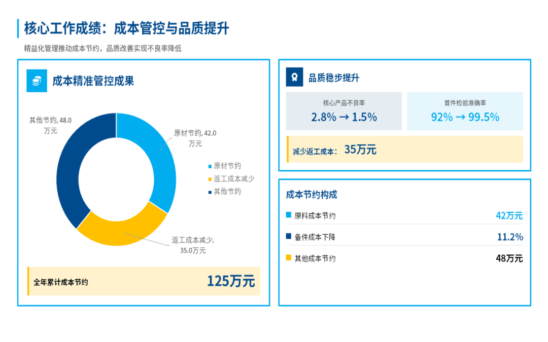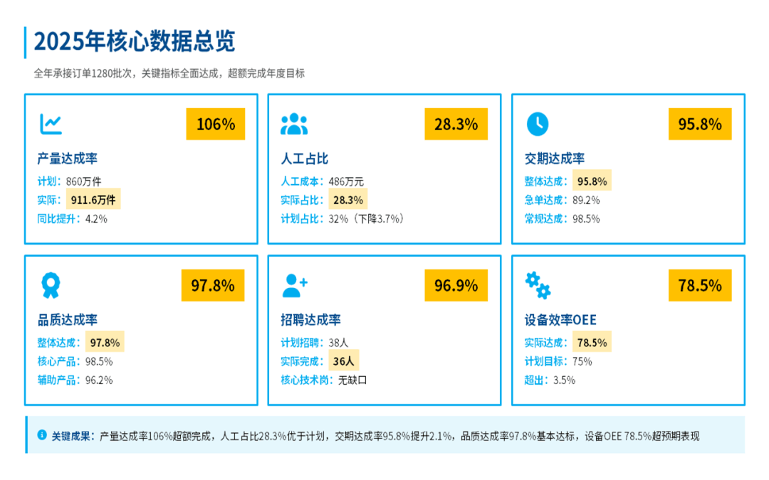 总体来看,在过去的一年,我们部门始终围着公司核心目标转,在提升产能、控制成本和团队建设上,还是下了很多功夫的,也见到了一些实实在在的效果。比如说产量、交货期、产品合格率这些关键指标,我们都达成了,不少还超出了原定的计划目标。这些成绩的取得,是产线自动化升级和工艺的持续优化所带来的,既帮我们提升了效率,也为公司省了不少钱。