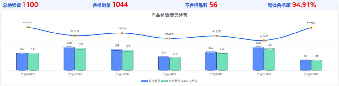 这个部分在第一行对产品总检验数量、合格产品数量、不合格产品数量、最终的产品合格率进行汇总计算。另个图表部分对产品检验数量、合格数量以及合格率使用了柱形图和折线图的组合图来展示。