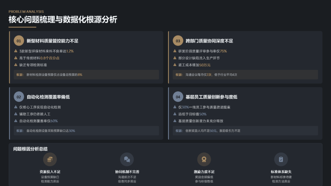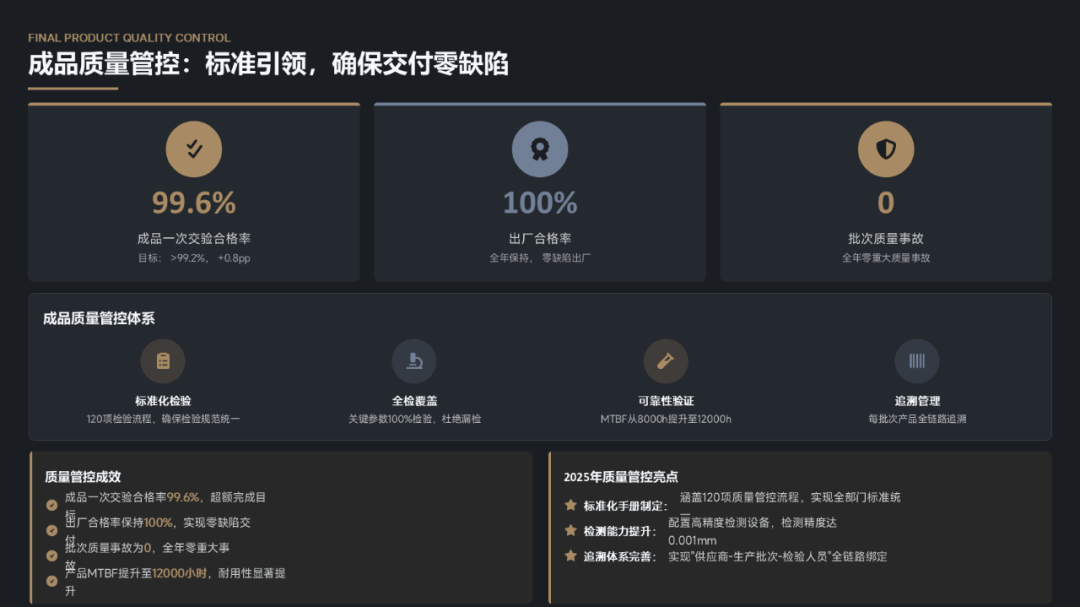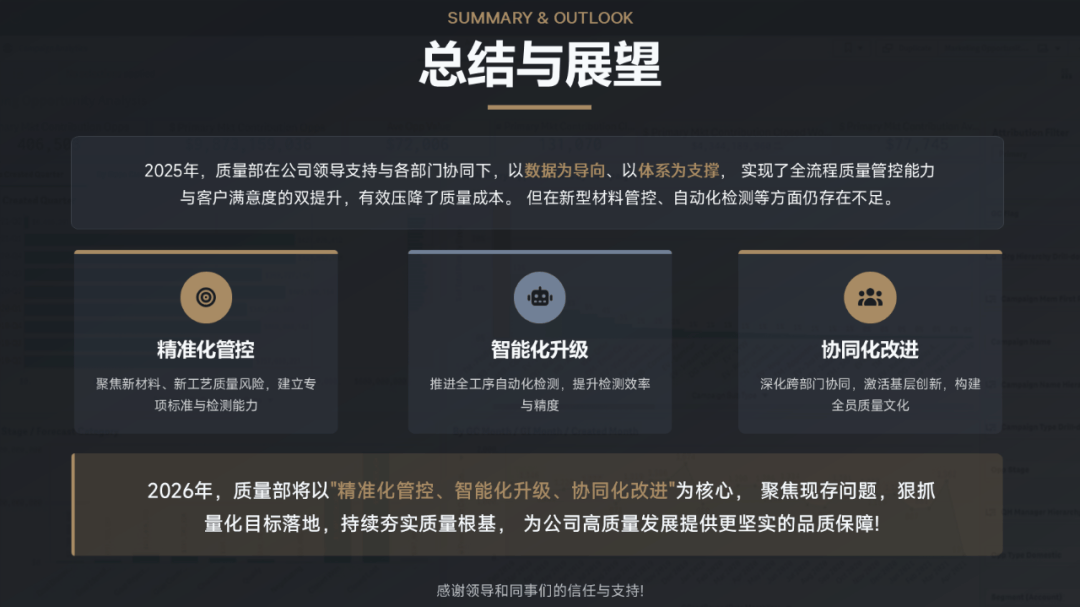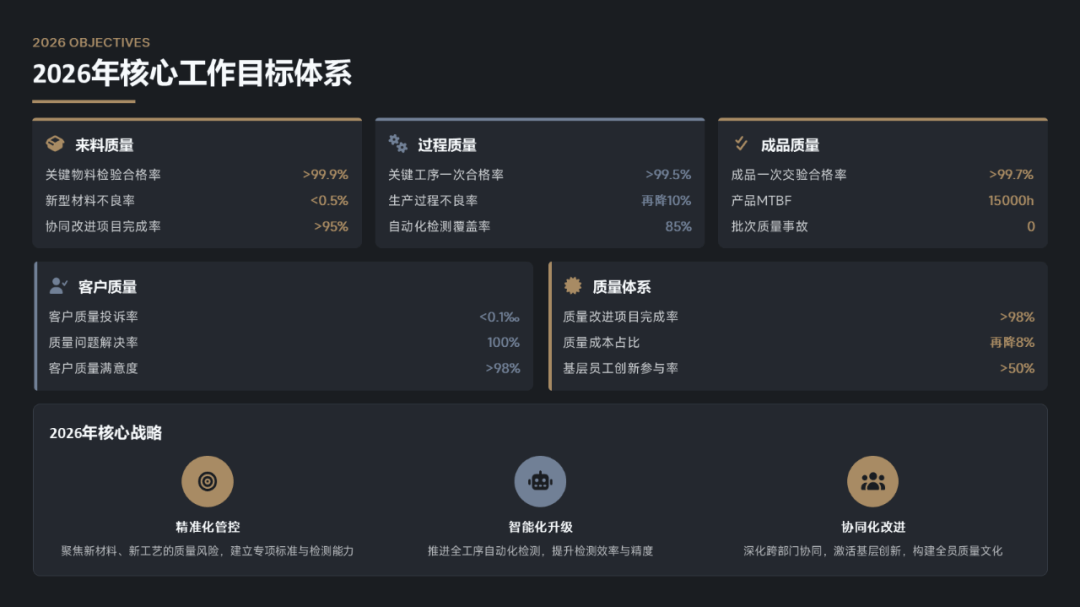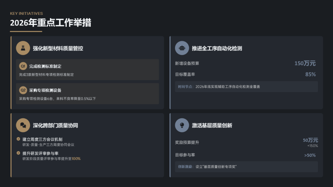 不过我们也发现了小问题,比如新型材料管控、自动化检测覆盖还不够。2026年我们计划补短板,把新型材料不良率压到0.5% 以下,自动化检测覆盖率提至85%,再深化跨部门协同,激发一线伙伴的质量创新活力。