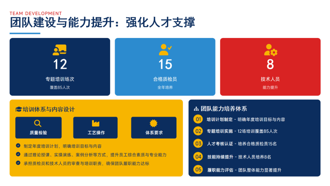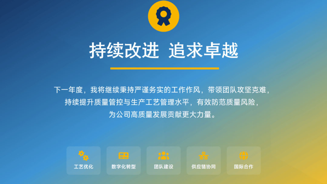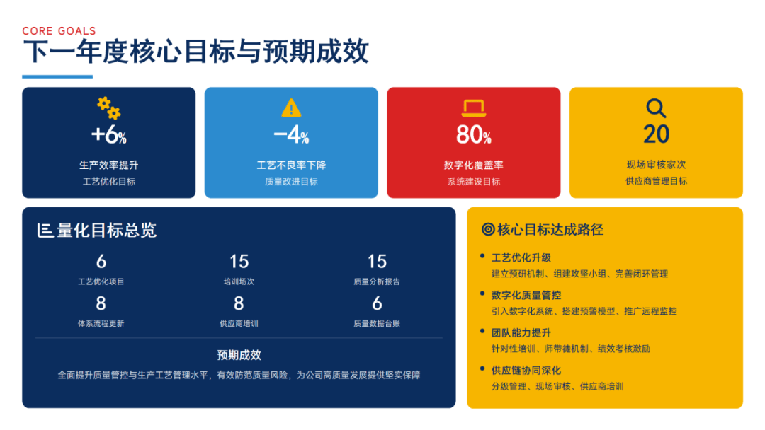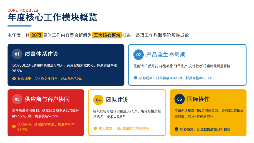 今天这这个2025年度质量经理年终工作总结PPT模板,结合该位质量经理3年实战经验,从产品工艺管理、质量检验标准制定、质量体系维护,到客户投诉处理、供应商管理,拆解5大核心模块的实操方法,原PPT是可以直接抄的工具模板,帮助大家轻松解决质量痛点,提升管理效率!