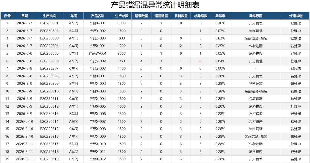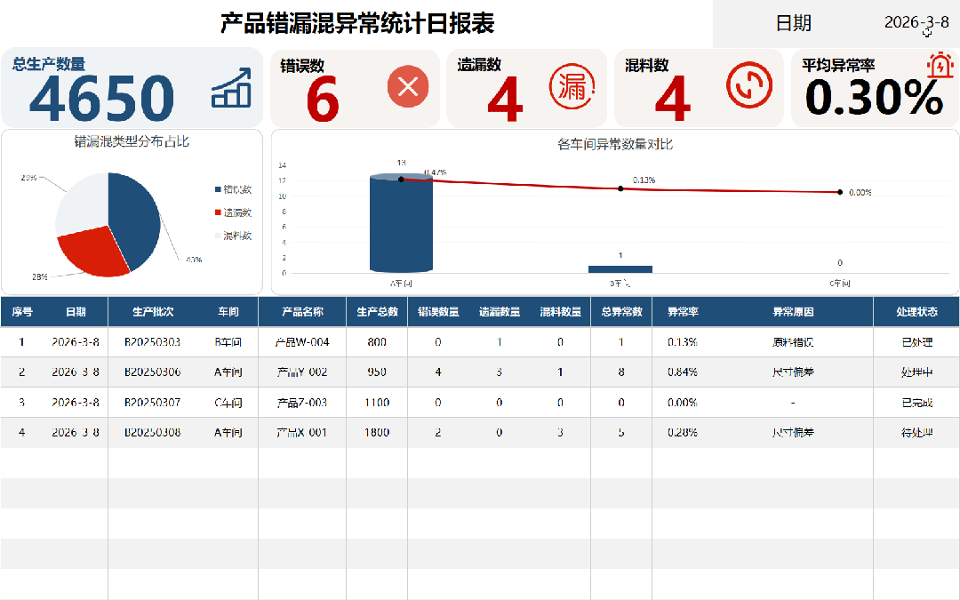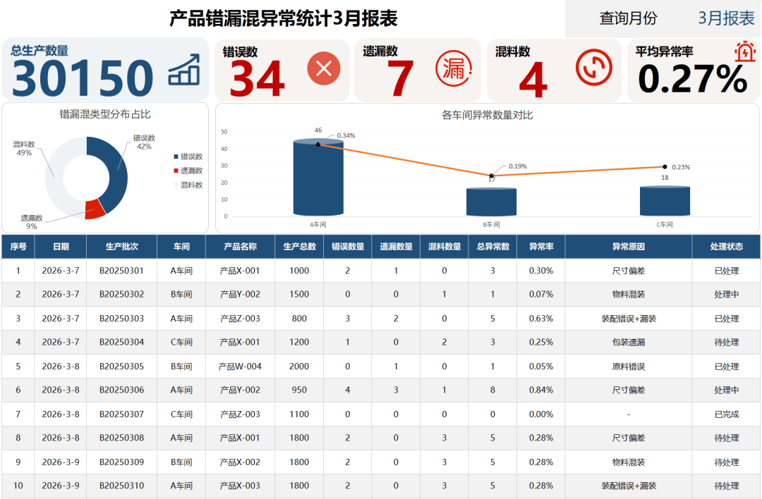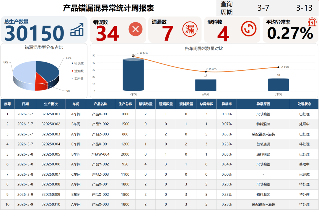 做生产、管质量的人都知道一个扎心真相:哪怕99%的环节都做到非常完美,但只要有一次错漏混,所有努力都可能功亏一篑。不管是某个车间、还是某个产线一批产品错装零件、一份批次漏检关键项、不同规格物料混装出厂,这些看似微小的失误,都会增加返工损耗、客户投诉的成本。你是否也在被“错漏混”困扰,无法精准统计异常,今天我们分享的产品错漏混异常统计表模板包括将明细登记好后就可以自动出日报表、周报表、月报表的功能,不管是Wps还是Excel打开都可以使用。也可以适当于调整用于不良品统计、不良原因统计使用。