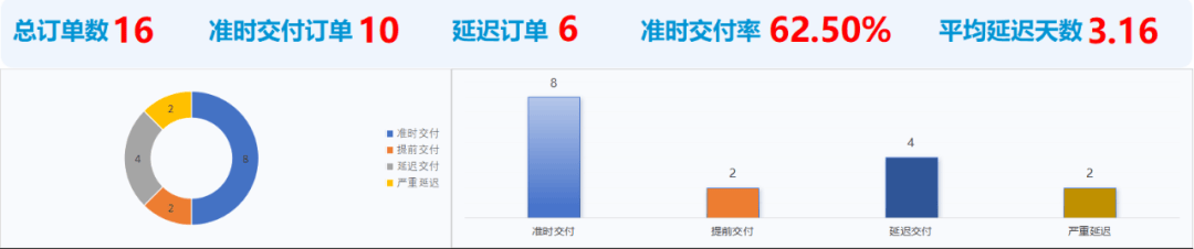 这个部分统计了总订单数是多少,准时交付订单的数量,延迟订单的数量,准时交付率多少,平均延迟天数是多少,这些内容使用了大号醒目字体进行显示,让我们一目了然,这些内容都是使用公式进行自动统计,不需要手动干预。另外就是对交付的几种状态(如准时交付、提前交付、延迟交付、严重延迟)使用圆环图和柱形图进行展示。