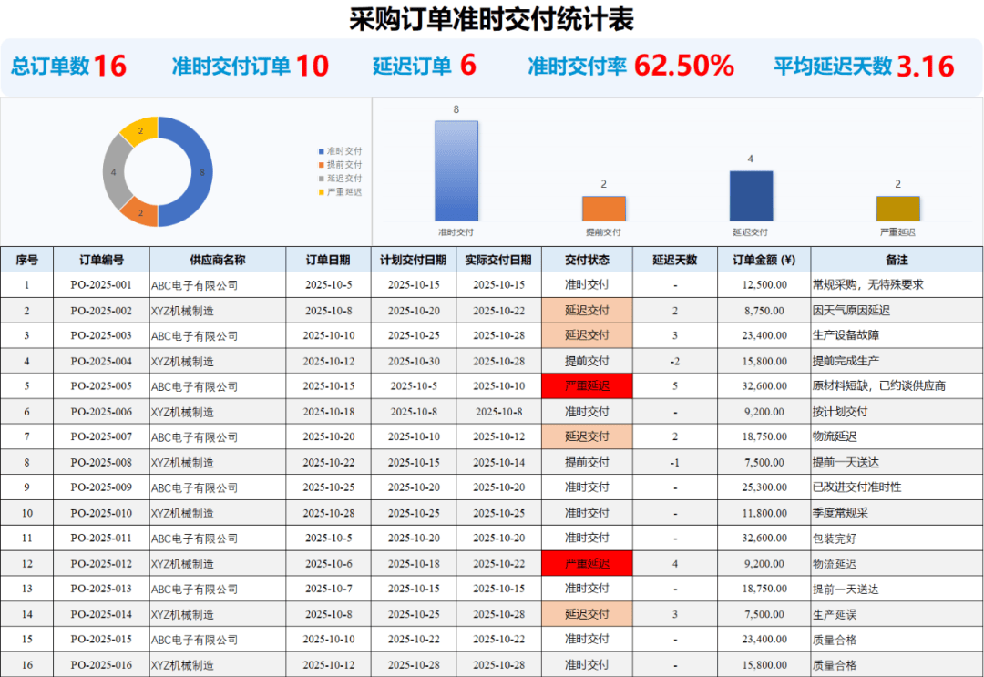别再手动算延迟!采购交付表模板:含图表+自动公式,总订单/准时率全搞定