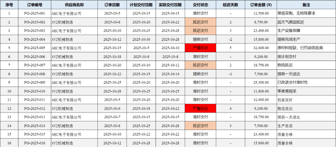 这个部分对我们的采购订单进行明细统计,如订单编号、供应商名称、计划交付日期、实际交付日期,并通过公式计算出交付状态,如准时交付、提前交付、迟延交付等,延迟交付使用了加深背景醒目显示;如果是延迟,延迟天数是多少,这个也是使用公式自动计算出来的。