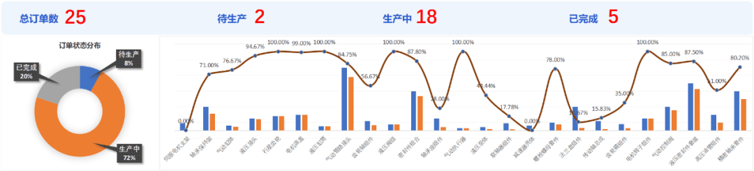 图表部分分为订单状态分布(这里订单状态分为待生产、生产中和已完成三种状态),各种产品已完成数量、生产进度的柱形图和曲线组合图。只要在基础数据里面的数据内容变化,图表会自动变化,不需要手动干预。